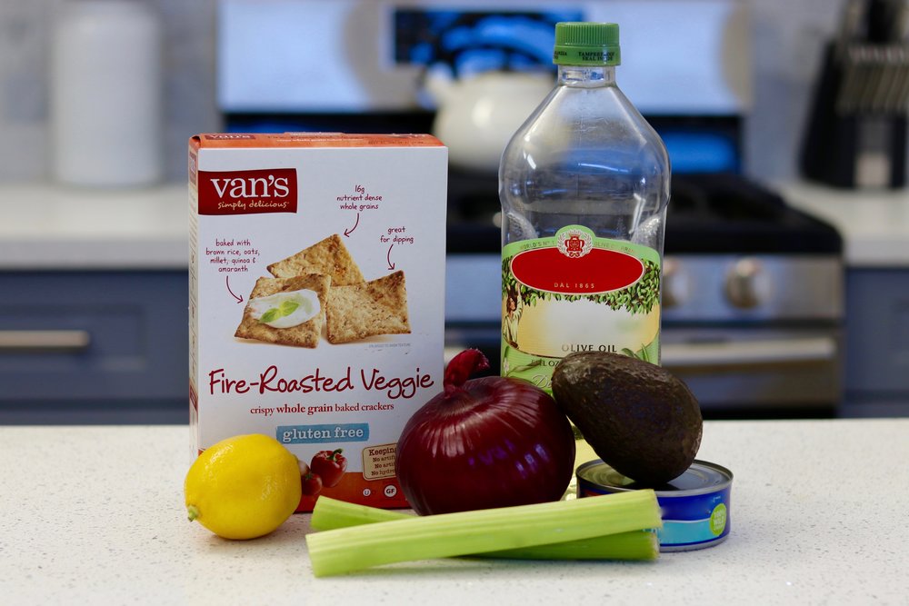 Once all of your ingredients are prepped, simply combine them in a bowl and spoon mixture onto Van’s Fire Roasted Veggie Gluten Free Crackers!
